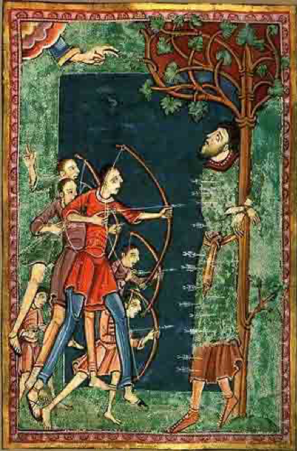 I found a number of depictions of St. Edmund from various time periods of history. These incredible pieces show different versions of Edmund- saint, martyr, king. The first work I found was an illumination from a medieval manuscript.